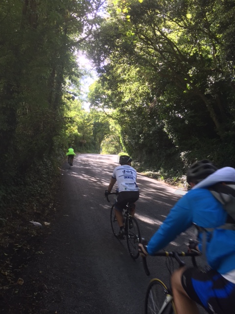 Some of the roads were well tree lined and it was like a tunnel in places. This is Steve, Nick, and Jack pushing on in front of me.
