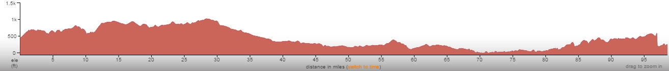So the stats: cycled 99 miles, ave. speed 14.0 mph, 6:59 hrs on the bike, climbed 5,243 feet, ave. temp 15.4 centigrade.