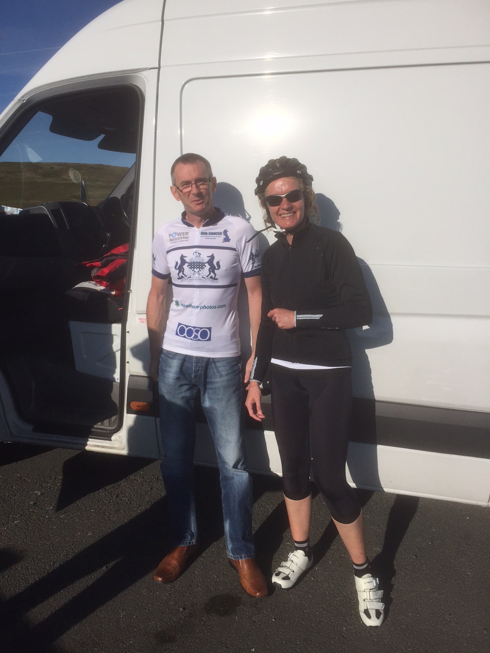 Bright sunshine and support vehicle on top of Shap Summit. Bob and Anita.