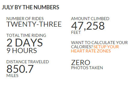 | Jul 2015 | 23 | 850 miles | 47,258 ft | 5,560 ft | distance focus |