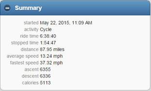 | Aug 2015 | 17 | 601 miles | 45,449 ft | 7,562 ft | lot of climbing |