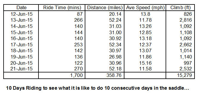 I cycled each day for 10 days trying to cover between 20 and 50 miles each day. I totalled over 28 hours in 10 days and covered almost 360 miles and climbed almost 3 miles. It was tough but gave me confidence that I could manage the 10 days of JOGLE.