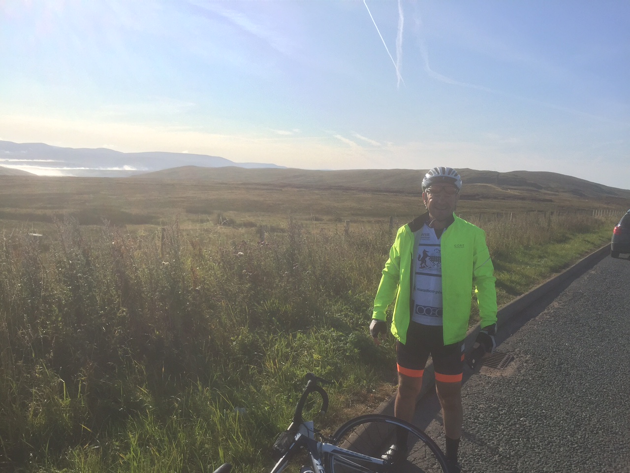 Bright sunshine and support vehicle on top of Shap Summit. Bob and Anita.