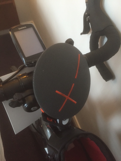The latest addition is a 'sound system'. This is a fantastic Bluetooth loudspeaker attached by a bungee cord that connects to my iphone so I can play loud music when I am flagging during a ride (of course only loud when there are no others to hear it). It is from Logictech - a 'UE Roll' - waterproof and USB chargeable and the sound quality it just great. [link here.]